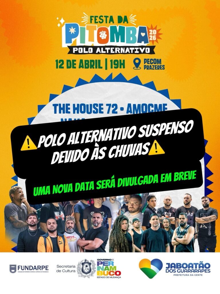 A Prefeitura do Jaboatão dos Guararapes informa que decidiu adiar as apresentações do polo alternativo da Festa da Pitomba 2026, localizado sob o Viaduto Geraldo Melo, conhecido como PECOM, em Prazeres. A medida foi adotada em razão das fortes chuvas registradas nas últimas horas e da previsão de continuidade das precipitações, visando garantir a segurança de artistas, equipes técnicas e do público.