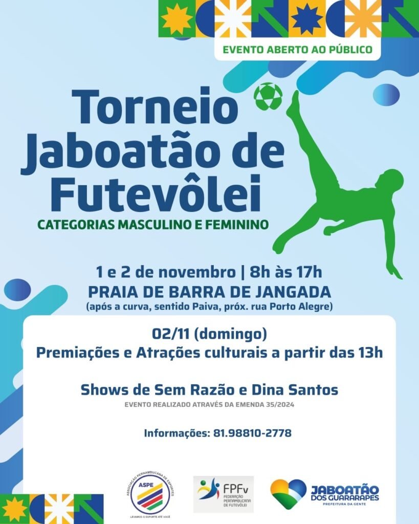 A Praia de Barra de Jangada será palco, neste sábado (1º) e domingo (2), do Torneio Jaboatão de Futevôlei, promovido pela Prefeitura do Jaboatão dos Guararapes, em parceria com a Associação Pernambucana de Esportes (ASPE) e a Federação Pernambucana de Futevôlei (FPFv). A programação acontece das 8h às 17h, reunindo mais de 50 atletas nas categorias masculino e feminino para dois dias de disputas intensas, música e lazer à beira-mar.