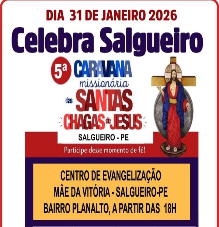 Salgueiro vive um momento especial de fé e devoção. Está tudo pronto para a Caravana das Santas Chagas de Jesus, que acontece neste sábado, 31 de janeiro, na Comunidade Católica Mãe da Vitória. O evento contará com a presença da equipe do Padre Reginaldo Manzotti, reunindo fiéis de Salgueiro e de toda a região do Sertão Central para uma noite de oração, espiritualidade e renovação da fé.