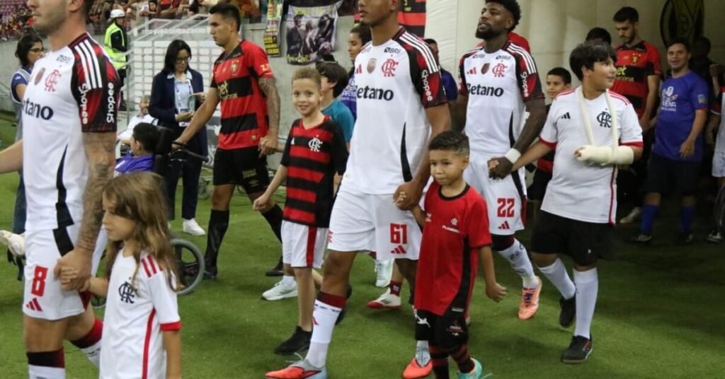 Crianças da escolinha entrando com jogadores do Flamengo na Arena de Pernambuco (Flamengo x Sport) Foto: Reprodução/EFC