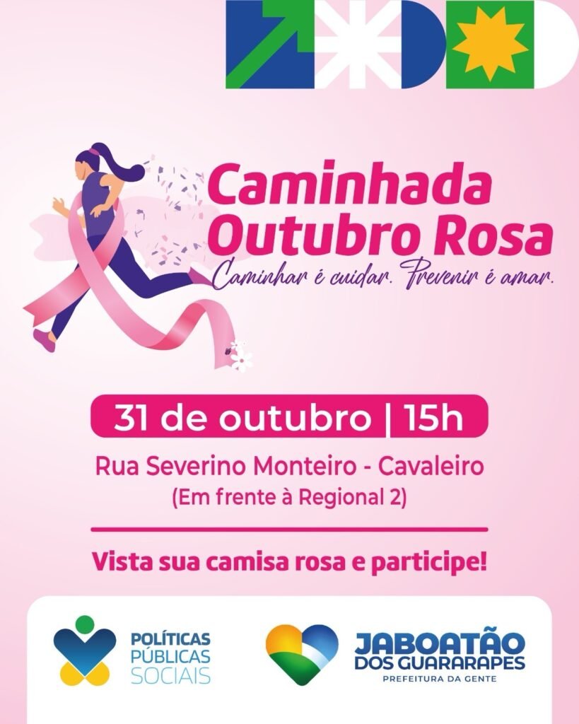 A Prefeitura do Jaboatão dos Guararapes realiza, nesta sexta-feira (31), a IV Caminhada Outubro Rosa, o maior evento de sensibilização pela saúde da mulher no município. A iniciativa integra o calendário de ações do Programa de Políticas Públicas Sociais (PPS), coordenado pela primeira-dama Andréa Medeiros, com as secretarias de Saúde; Assistência Social e Cidadania; Educação; Governo; Desenvolvimento Econômico; e Infraestrutura.