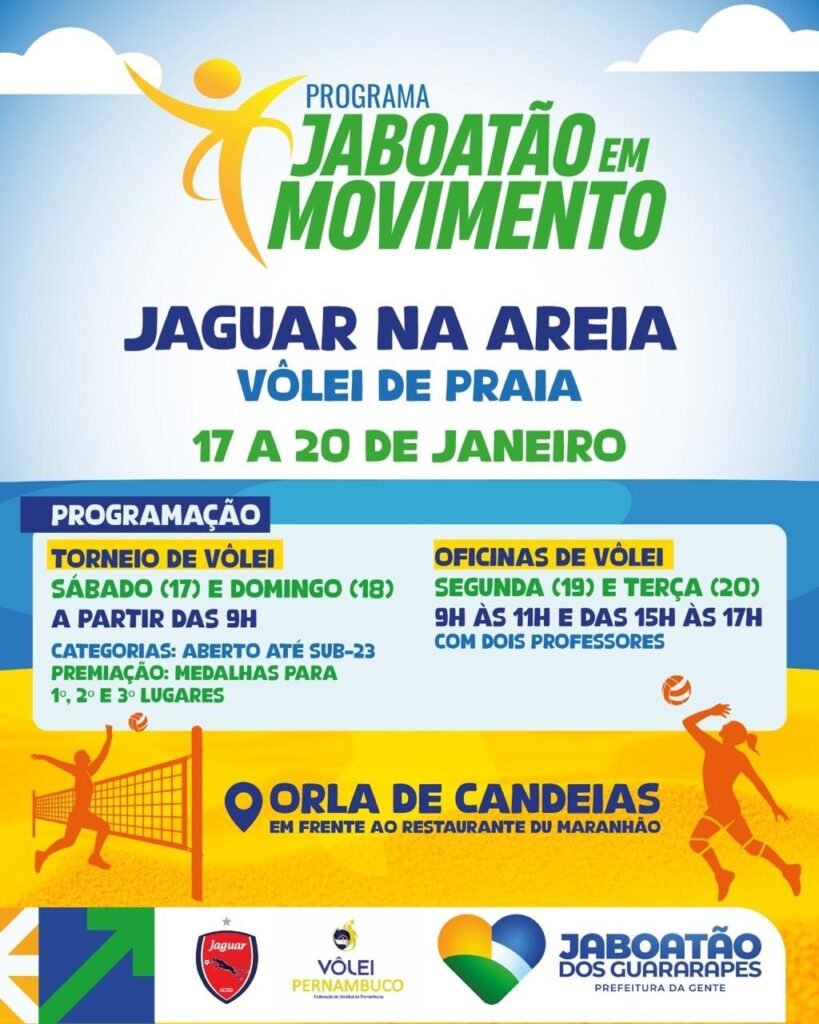 A Associação Desportiva do Jaboatão dos Guararapes, o Jaguar, em parceria com a Prefeitura do Jaboatão dos Guararapes, por meio da Secretaria de Desenvolvimento Econômico, Turismo, Cultura e Esportes, promove, a partir deste sábado (17), uma série de eventos esportivos para movimentar a Orla de Candeias. Ao longo dos próximos três fins de semana, na altura em frente ao restaurante Du Maranhão, uma modalidade diferente estará em destaque, promovendo a valorização dos esportes de areia, incentivando e descobrindo novos talentos.