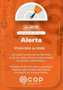 O Centro de Operações do Recife (COP) informa que a cidade entrou em estágio de ALERTA às 5h desta terca-feira (7)