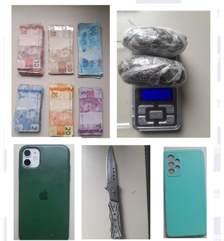 Todo o material apreendido foi levado para a Delegacia de Polícia Civil com o suspeito de tráfico, que está sendo investigado.