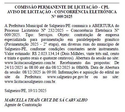 As propostas podem ser enviadas de forma virtual entre os dias 24 de novembro e 8 de dezembro, através do site Licitação Salgueiro. O julgamento das ofertas está previsto para o dia 8 de dezembro, a partir das 8h.