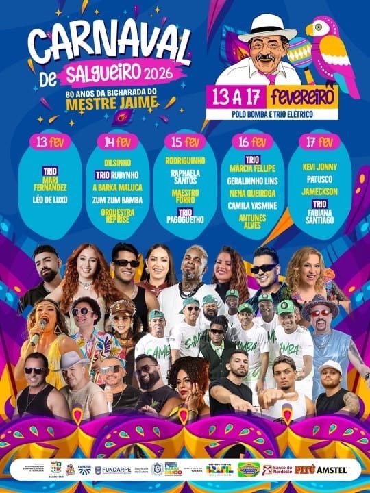 A Prefeitura de Salgueiro divulgou neste domingo, 8, a programação completa do Carnaval de 2026, com tema “80 anos da Bicharada do Mestre Jaime”.