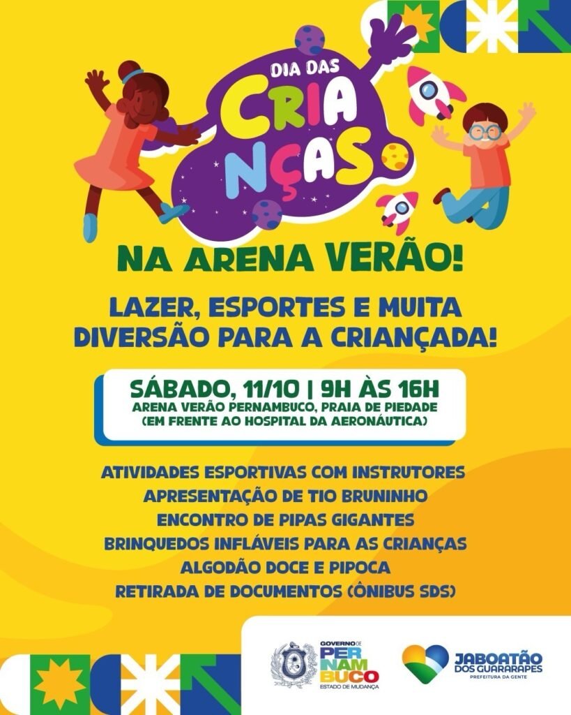 Com o objetivo de promover momentos de alegria, lazer e integração familiar, a programação contará com atividades recreativas, música, apresentações artísticas, brinquedos infláveis e muito mais. As comemorações têm início nos dias 11 e 12 de outubro, na Arena Verão Pernambuco, localizada na Orla de Piedade, em frente ao Hospital da Aeronáutica — uma realização em parceria com o Governo do Estado. No local, das 8h às 11h30, o público poderá participar de atividades esportivas com instrutores, apresentações infantis (dias 11 e 12), encontro de pipas gigantes (dia 11) e aproveitar brinquedos infláveis (dia 11).