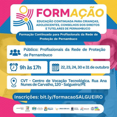 Dedicado à Rede de Proteção de Pernambuco, o curso será realizado entre esta quarta, 22, e sexta-feira, 24, e nos dias 30 e 31 de outubro, das 9h s 17h, no Centro Vocacional Tecnológico (CVT), localizado na região central da cidade.