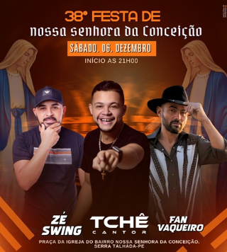 A comunidade do bairro Nossa Senhora da Conceição, em Serra Talhada, realiza no próximo sábado, 6, a 38ª edição da tradicional Festa de Nossa Senhora da Conceição. Os moradores locais e de outros bairros da cidade curtirão shows de Zé Swing, Tchê Cantor e Fan Vaqueiro.