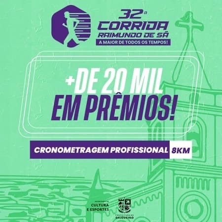 Com o slogan “A Maior de Todos os Tempos”, a 32ª Corrida Raimundo de Sá será realizada na manhã do dia 23 de dezembro, com largada e chegada na Praça da Igreja Matriz. Os competidores vão percorrer 8 km nas categorias: Local, masculino e feminino (18 a 39 anos); Master Local, masculino e feminino (a partir de 40 anos); Visitante, masculino e feminino (18 a 39 anos); e Master Visitante, masculino e feminino (a partir de 40 anos). Os três melhores de cada categoria recebem premiação em dinheiro e troféu.